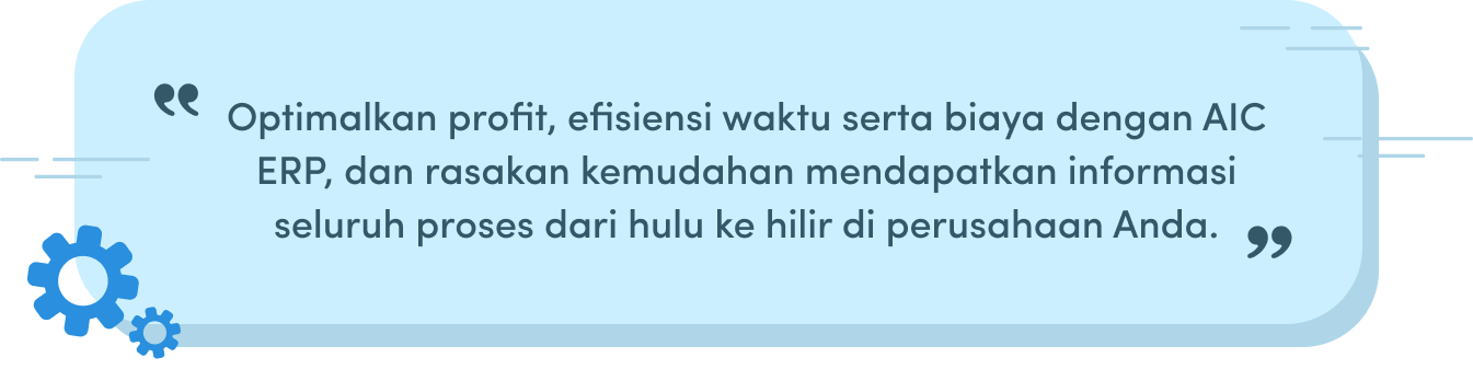 Sistem AIC ERP yang saling terintegrasi mulai dari surat penawaran sampai penerimaan barang ke pelanggan, sehingga dapat menghasilkan laporan yang akurat dan cepat sehingga memudahkan pemilik bisnis untuk mengambil keputusan yang tepat.